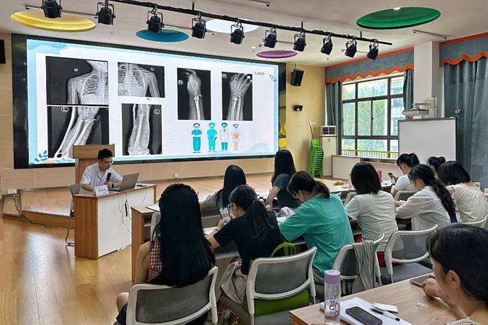 内三科韦倩倩医生以幼儿常见传染病为核心,重点讲解了科学预防措施。她结合幼儿园集体生活特点,从环境清洁消毒、幼儿日常健康监测等方面给出指导,帮助教职工建立传染病防控认知,为构建幼儿园传染病防控屏障提供支持。骨科杨俊杰医生聚焦幼儿常见外伤场景,针对性讲解擦伤、扭伤、骨折等意外的识别要点、紧急处理流程及后续护理方法。他通过案例分析拆解关键步骤,强调“先判断、再处置”的原则,有效提升了教职工应对突发外伤的实操能力,让大家在面对幼儿意外受伤时能更冷静、规范地处理。