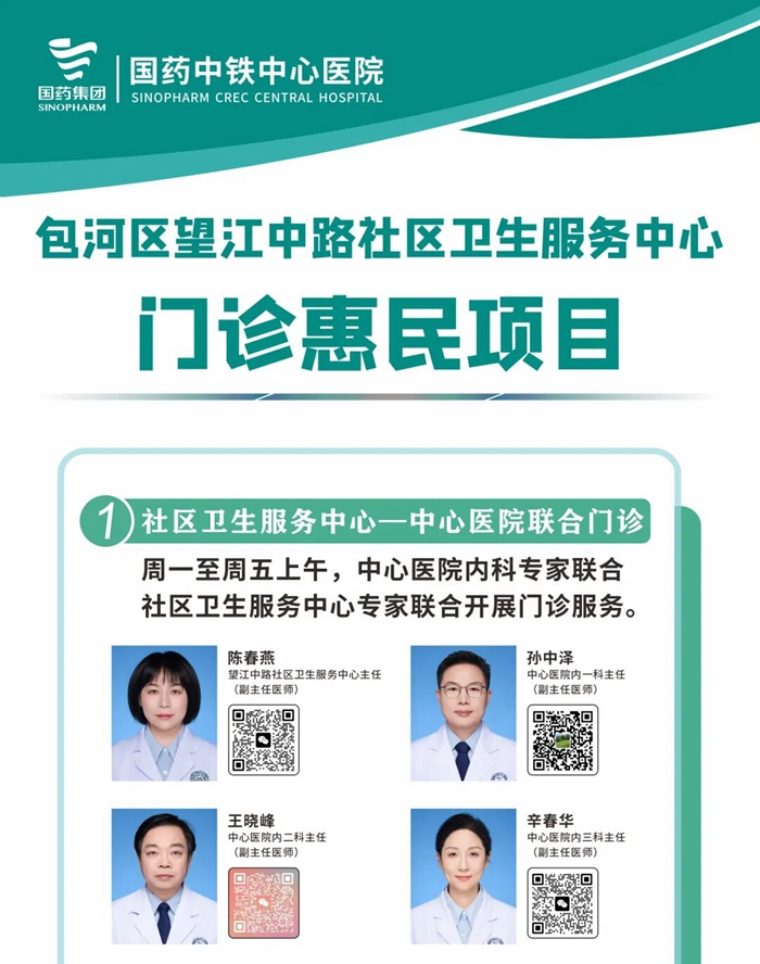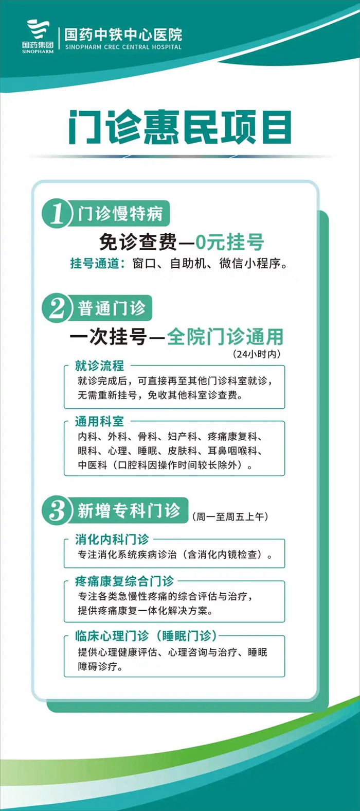 为积极响应国家卫健委“改善就医感受,提升患者体验”专项行动号召,简化门诊就医流程,切实减轻群众就医负担,国药中铁中心医院推出门诊慢特病免诊查费,一次挂号全院门诊通用,周一至周五新增三个专科门诊,联合门诊,检后门诊等多项惠民措施,具体如下: